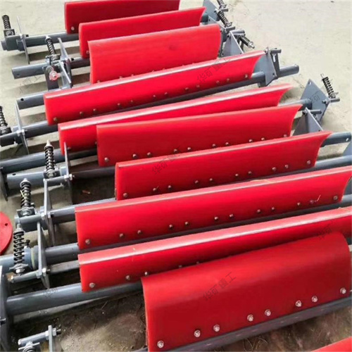 清掃器,刮板借彈簧壓力緊貼輸送帶的載荷面清掃卸載后粘結(jié)在輸送帶上的煤粉。清掃器在輸送機上有著不可忽視的作用。在運行中,如果人為的清除機尾滾筒附著物,往往容易發(fā)生嚴(yán)重人身傷亡事故。而清掃器有及時、方便地、快速的清除滾筒附著物的特點。