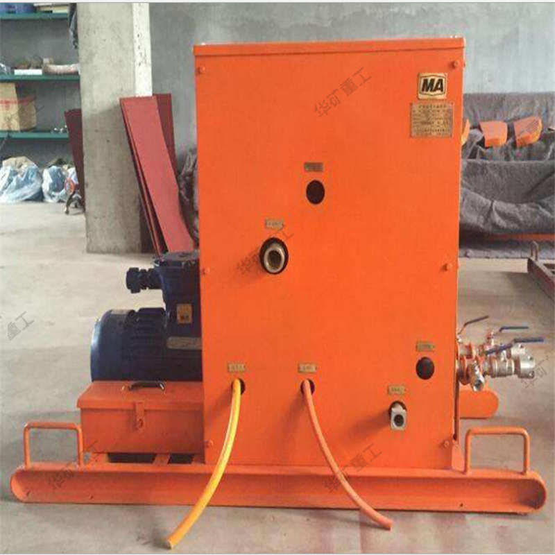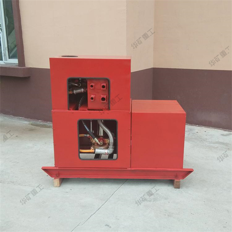 主泵用來(lái)輸送已加入促凝劑的水,輔泵用來(lái)輸送液態(tài)純膠(如水玻璃),這兩種液料經(jīng)各自的輸送膠管輸送到混合器中均勻混合后,經(jīng)三個(gè)出液口送出。根據(jù)各料的配比不同,這種液態(tài)的高水膠料混合液可在30~400秒內(nèi)形成固態(tài)膠體,用于煤礦滅火和防火。