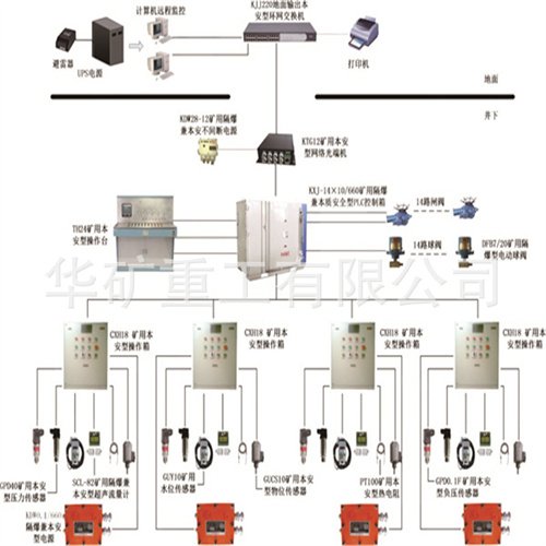 KJ416礦用水泵監(jiān)控系統(tǒng)主要由KXJ14×10/660隔爆兼本安型PLC控制箱、TH24礦用本安型操作臺(tái)、CXH18礦用本安型操作箱、監(jiān)控計(jì)算機(jī)及軟件、打印機(jī)、不間斷電源、多協(xié)議網(wǎng)關(guān)、多種傳感器及傳輸設(shè)備組成。