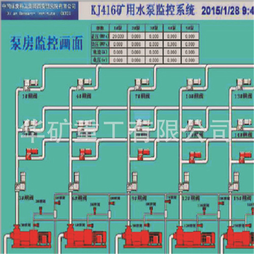 KJ416礦用水泵監(jiān)控系統(tǒng)是一套可對(duì)礦井水泵抽排水進(jìn)行集中監(jiān)控并能實(shí)現(xiàn)遠(yuǎn)程實(shí)時(shí)監(jiān)控的現(xiàn)代化控制系統(tǒng),該系統(tǒng)解決了現(xiàn)有礦井排水系統(tǒng)開(kāi)泵程序繁瑣,發(fā)生透水事故時(shí)無(wú)人開(kāi)啟備用水泵,系統(tǒng)故障以及排水效率低下等問(wèn)題。本系統(tǒng)通過(guò)各種先進(jìn)可靠的傳感器、保護(hù)器、電動(dòng)閘(球)閥、監(jiān)控電視等監(jiān)測(cè)煤礦井下排水系統(tǒng)各設(shè)備的工作狀態(tài),實(shí)現(xiàn)井下水位、水壓、水泵排水系統(tǒng)的自動(dòng)監(jiān)控,及時(shí)發(fā)現(xiàn)系統(tǒng)存在的隱患與故障點(diǎn)。此外,將監(jiān)測(cè)到的數(shù)據(jù)實(shí)時(shí)通過(guò)光纖上傳至地面上位系統(tǒng)可方便實(shí)現(xiàn)井下泵房遠(yuǎn)程控制。該系統(tǒng)與KJ117礦井水文監(jiān)測(cè)系統(tǒng)的聯(lián)動(dòng),可以實(shí)時(shí)監(jiān)控礦井上下水文觀測(cè)孔水壓、水溫、流量以及采空區(qū)水位,排水明渠等水文參數(shù),通過(guò)多種傳感器的實(shí)時(shí)監(jiān)測(cè)可實(shí)現(xiàn)對(duì)煤礦透水事故的預(yù)警,事故通過(guò)井下光纜將數(shù)據(jù)傳輸至生產(chǎn)調(diào)度中心監(jiān)控平臺(tái),系統(tǒng)預(yù)留井下通訊接口,并以指揮井下人員在發(fā)生透水事故時(shí)的緊急撤離,為及時(shí)啟動(dòng)礦井水災(zāi)應(yīng)急救援和最大限度地保證煤礦安全生產(chǎn)提供可靠技術(shù)手段。