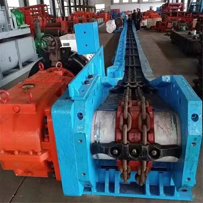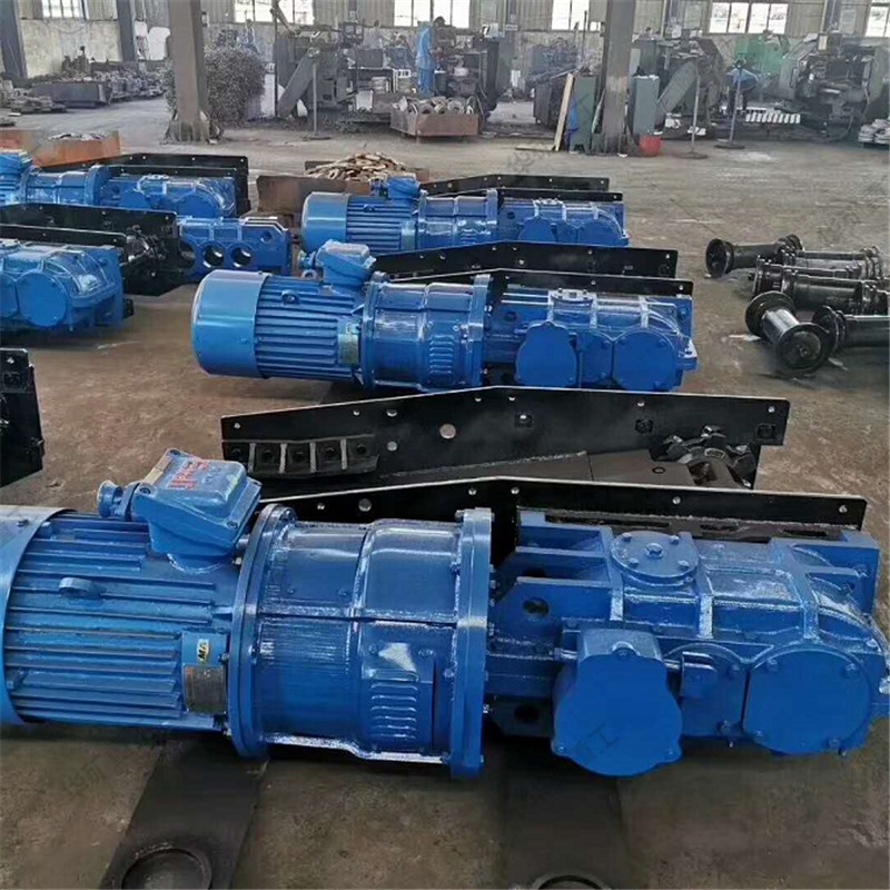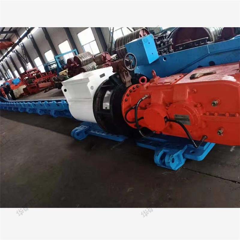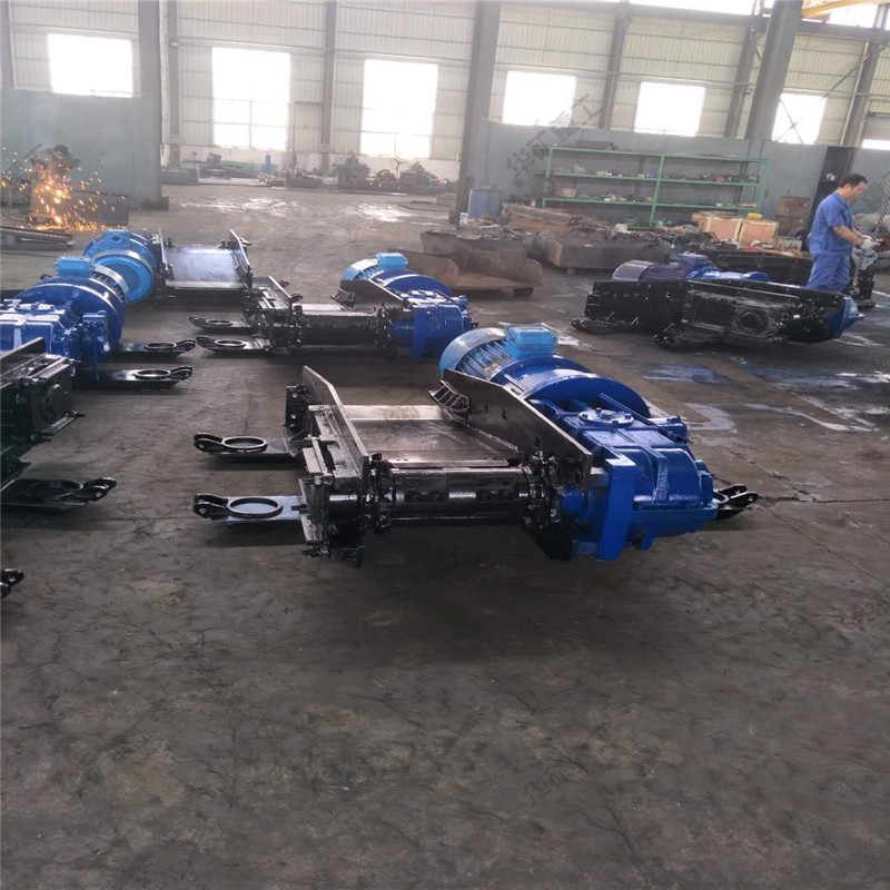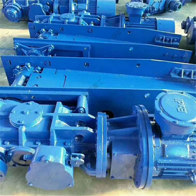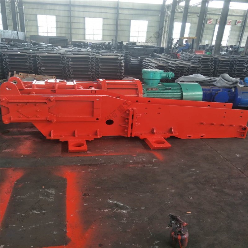 用刮板鏈牽引,在槽內(nèi)運送散料的輸送機叫刮板輸送機。它由機頭、中間部和機尾部等三個部分組成。此外,還有供推移輸送機用的液壓千斤頂裝置和緊鏈時用的緊鏈器等附屬部件。機頭部由機頭架、電動機、液力偶合器、減速器及鏈輪等件組成。中部由過渡槽、中部槽、鏈條和刮板等件組成。機尾部是供刮板鏈返回的裝置。